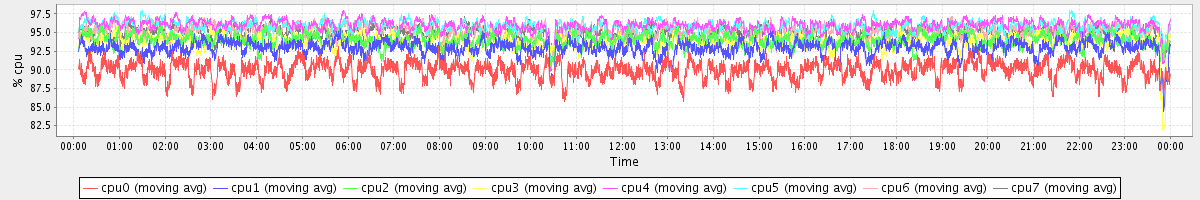 avg(cpu0) = 89.94 avg(cpu1) = 92.94 avg(cpu2) = 93.98 avg(cpu3) = 93.71 avg(cpu4) = 95.92 avg(cpu5) = 95.76 avg(cpu6) = 95.19 avg(cpu7) = 95.05