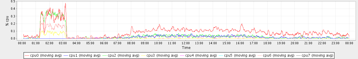 avg(cpu0) = 1.01 avg(cpu1) = 0.18 avg(cpu2) = 0.22 avg(cpu3) = 0.15 avg(cpu4) = 0.09 avg(cpu5) = 0.13 avg(cpu6) = 0.17 avg(cpu7) = 0.13