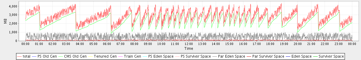 avg(total) = 2877.14 avg(PS Old Gen) = 0.00 avg(CMS Old Gen) = 2298.71 avg(Tenured Gen) = 0.00 avg(Train Gen) = 0.00 avg(PS Eden Space) = 0.00 avg(PS Survivor Space) = 0.00 avg(Par Eden Space) = 495.30 avg(Par Survivor Space) = 83.13 avg(Eden Space) = 0.00 avg(Survivor Space) = 0.00