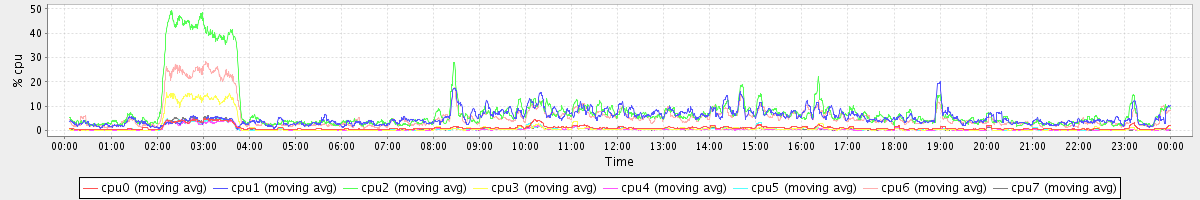 avg(cpu0) = 1.05 avg(cpu1) = 0.14 avg(cpu2) = 0.19 avg(cpu3) = 0.10 avg(cpu4) = 0.07 avg(cpu5) = 0.08 avg(cpu6) = 0.10 avg(cpu7) = 0.07