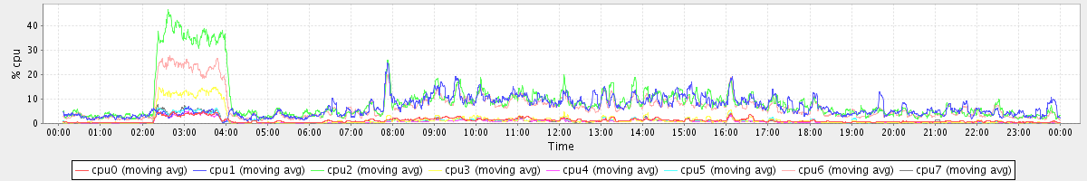 avg(cpu0) = 1.46 avg(cpu1) = 0.31 avg(cpu2) = 0.37 avg(cpu3) = 0.23 avg(cpu4) = 0.21 avg(cpu5) = 0.24 avg(cpu6) = 0.29 avg(cpu7) = 0.22