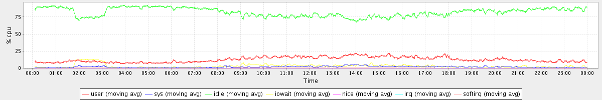 avg(user) = 12.59 avg(sys) = 1.85 avg(idle) = 82.10 avg(iowait) = 3.15 avg(nice) = 0.00 avg(irq) = 0.01 avg(softirq) = 0.30