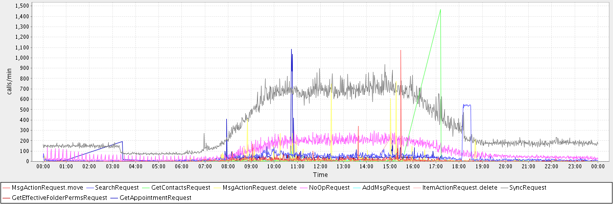 max(MsgActionRequest.move) = 1072.00 max(SearchRequest) = 550.00 max(GetContactsRequest) = 1465.00 max(MsgActionRequest.delete) = 772.00 max(NoOpRequest) = 295.00 max(AddMsgRequest) = 140.00 max(ItemActionRequest.delete) = 238.00 max(SyncRequest) = 936.00 max(GetEffectiveFolderPermsRequest) = 181.00 max(GetAppointmentRequest) = 1085.00