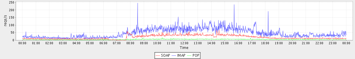 Host zm04.stanford.edu: Mailboxd: Request Rate by Client Protocol