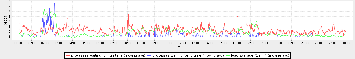avg(processes waiting for run time) = 1.56 avg(processes waiting for io time) = 0.39 avg(load average (1 min)) = 1.83
