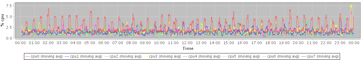 avg(cpu0) = 2.38 avg(cpu1) = 1.48 avg(cpu2) = 1.32 avg(cpu3) = 1.58 avg(cpu4) = 1.39 avg(cpu5) = 1.43 avg(cpu6) = 1.57 avg(cpu7) = 1.42