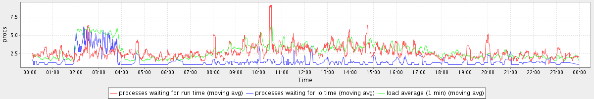 avg(processes waiting for run time) = 2.26 avg(processes waiting for io time) = 0.61 avg(load average (1 min)) = 2.87