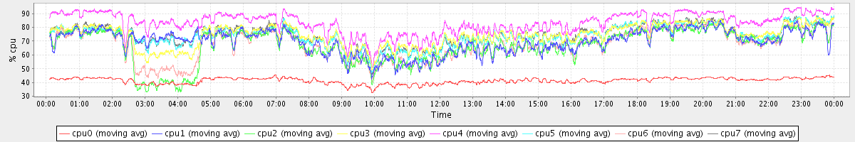 avg(cpu0) = 41.36 avg(cpu1) = 69.76 avg(cpu2) = 66.68 avg(cpu3) = 74.18 avg(cpu4) = 83.33 avg(cpu5) = 73.87 avg(cpu6) = 67.62 avg(cpu7) = 74.58
