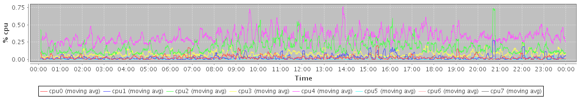 avg(cpu0) = 0.53 avg(cpu1) = 0.32 avg(cpu2) = 0.23 avg(cpu3) = 0.23 avg(cpu4) = 0.27 avg(cpu5) = 0.19 avg(cpu6) = 0.18 avg(cpu7) = 0.15