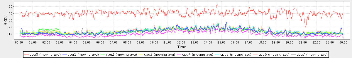 avg(cpu0) = 40.15 avg(cpu1) = 13.44 avg(cpu2) = 13.78 avg(cpu3) = 13.77 avg(cpu4) = 9.65 avg(cpu5) = 14.01 avg(cpu6) = 14.56 avg(cpu7) = 13.34