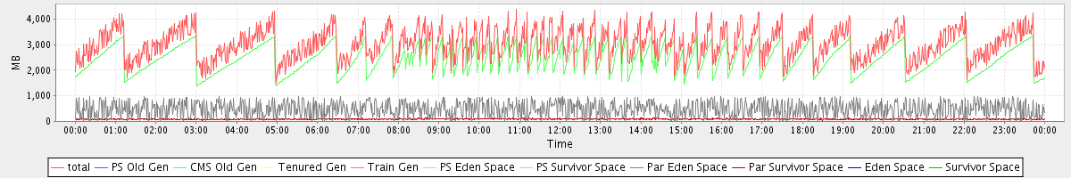 avg(total) = 3017.38 avg(PS Old Gen) = 0.00 avg(CMS Old Gen) = 2447.71 avg(Tenured Gen) = 0.00 avg(Train Gen) = 0.00 avg(PS Eden Space) = 0.00 avg(PS Survivor Space) = 0.00 avg(Par Eden Space) = 480.58 avg(Par Survivor Space) = 89.08 avg(Eden Space) = 0.00 avg(Survivor Space) = 0.00