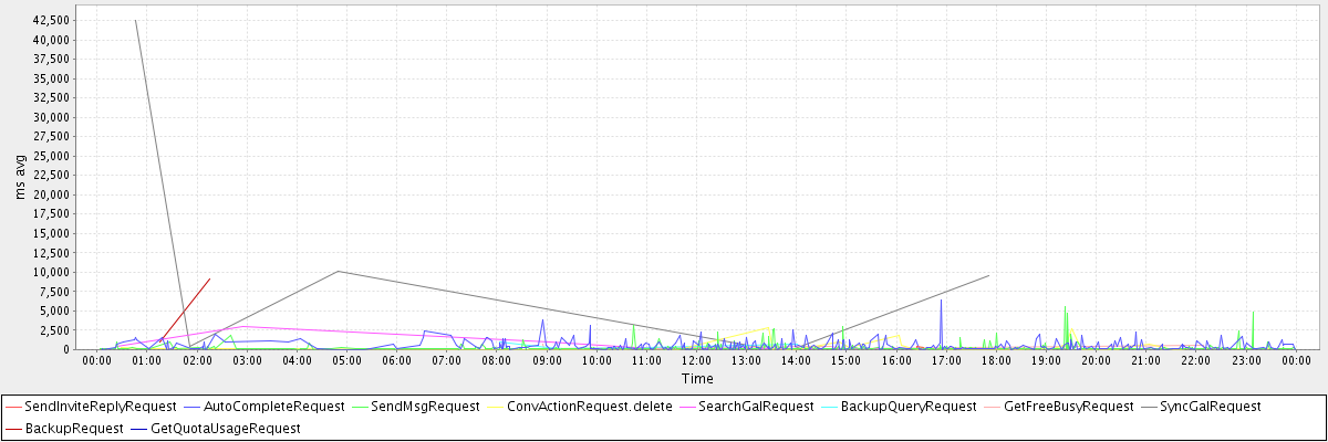 avg(SendInviteReplyRequest) = 352.00 avg(AutoCompleteRequest) = 511.71 avg(SendMsgRequest) = 240.76 avg(ConvActionRequest.delete) = 298.13 avg(SearchGalRequest) = 814.00 avg(BackupQueryRequest) = 471.60 avg(GetFreeBusyRequest) = 263.73 avg(SyncGalRequest) = 10454.33 avg(BackupRequest) = 5041.50 avg(GetQuotaUsageRequest) = 2322.00