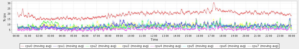 avg(cpu0) = 19.53 avg(cpu1) = 8.60 avg(cpu2) = 8.70 avg(cpu3) = 8.71 avg(cpu4) = 5.79 avg(cpu5) = 7.69 avg(cpu6) = 7.48 avg(cpu7) = 7.38