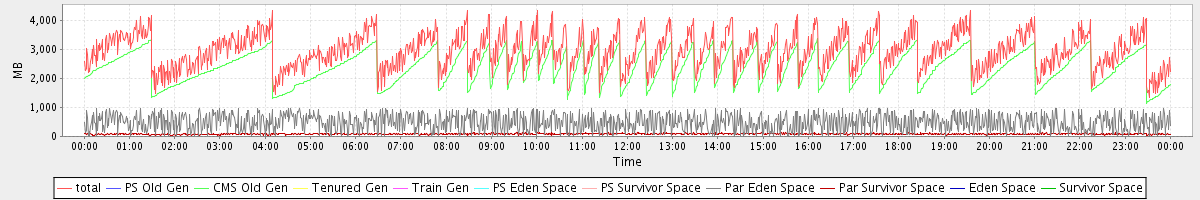 avg(total) = 2947.65 avg(PS Old Gen) = 0.00 avg(CMS Old Gen) = 2376.97 avg(Tenured Gen) = 0.00 avg(Train Gen) = 0.00 avg(PS Eden Space) = 0.00 avg(PS Survivor Space) = 0.00 avg(Par Eden Space) = 486.08 avg(Par Survivor Space) = 84.60 avg(Eden Space) = 0.00 avg(Survivor Space) = 0.00