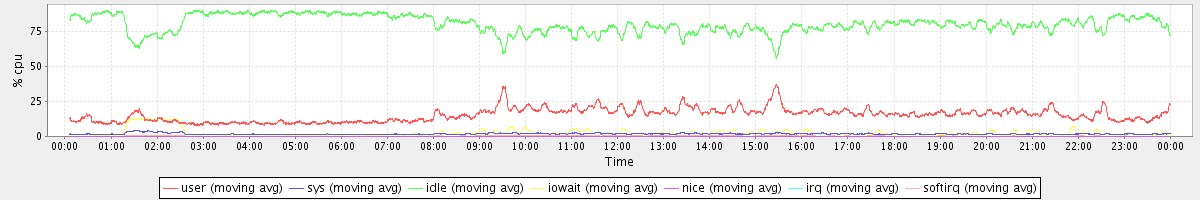 avg(user) = 15.28 avg(sys) = 1.80 avg(idle) = 80.08 avg(iowait) = 2.52 avg(nice) = 0.00 avg(irq) = 0.01 avg(softirq) = 0.29