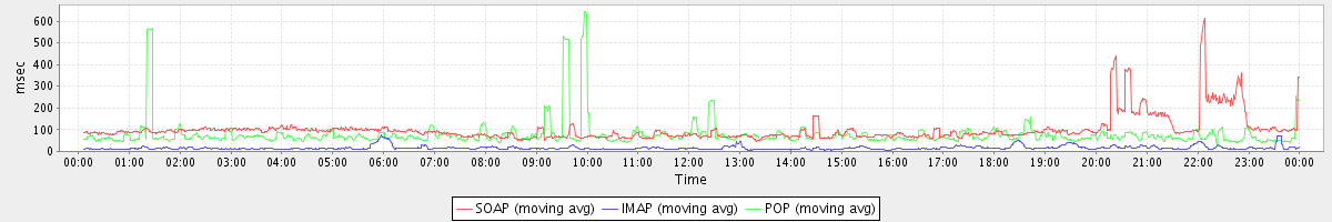avg(ModifyTaskRequest) = 443.00 avg(BackupQueryRequest) = 572.17 avg(SyncGalRequest) = 2974.72 avg(SendInviteReplyRequest) = 472.81 avg(AutoCompleteRequest) = 585.40 avg(ApplyFilterRulesRequest) = 52177.00 avg(ConvActionRequest.delete) = 383.43 avg(FolderActionRequest.empty) = 2143.73 avg(BackupRequest) = 3914.50 avg(GetQuotaUsageRequest) = 882.00