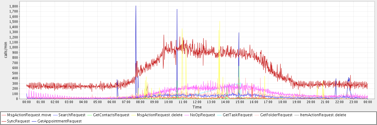 max(MsgActionRequest.move) = 305.00 max(SearchRequest) = 150.00 max(GetContactsRequest) = 636.00 max(MsgActionRequest.delete) = 1512.00 max(NoOpRequest) = 357.00 max(GetTaskRequest) = 307.00 max(GetFolderRequest) = 445.00 max(ItemActionRequest.delete) = 266.00 max(SyncRequest) = 1245.00 max(GetAppointmentRequest) = 1807.00