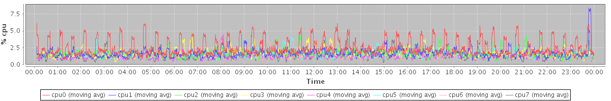 avg(cpu0) = 2.51 avg(cpu1) = 1.67 avg(cpu2) = 1.66 avg(cpu3) = 1.70 avg(cpu4) = 1.35 avg(cpu5) = 1.60 avg(cpu6) = 1.41 avg(cpu7) = 1.34