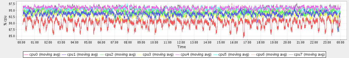 avg(cpu0) = 90.10 avg(cpu1) = 93.59 avg(cpu2) = 94.01 avg(cpu3) = 93.37 avg(cpu4) = 95.92 avg(cpu5) = 95.39 avg(cpu6) = 95.32 avg(cpu7) = 95.55