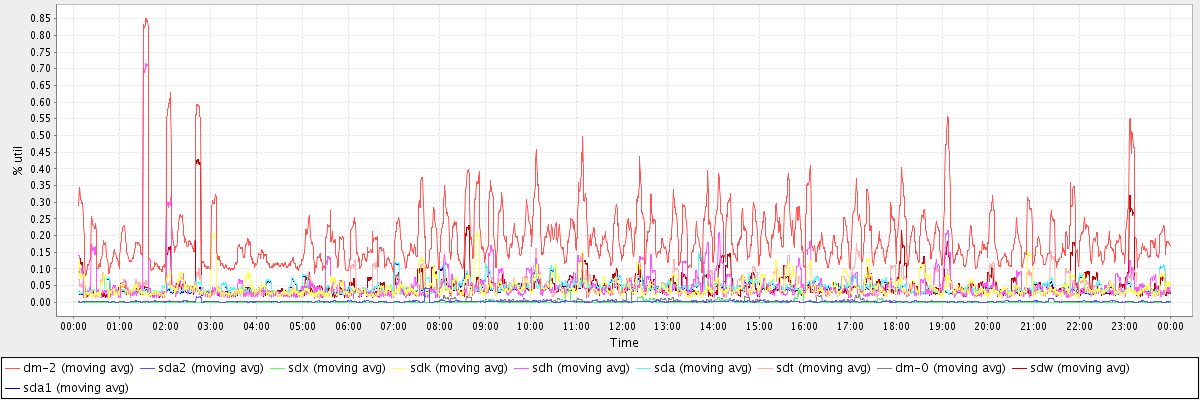 avg(dm-2) = 0.20 avg(sda2) = 0.00 avg(sdx) = 0.00 avg(sdk) = 0.05 avg(sdh) = 0.05 avg(sda) = 0.05 avg(sdt) = 0.05 avg(dm-0) = 0.00 avg(sdw) = 0.05 avg(sda1) = 0.04
