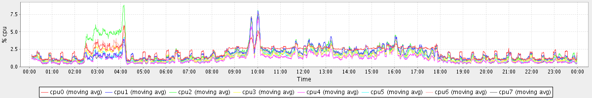 avg(cpu0) = 1.88 avg(cpu1) = 0.31 avg(cpu2) = 0.34 avg(cpu3) = 0.23 avg(cpu4) = 0.18 avg(cpu5) = 0.24 avg(cpu6) = 0.29 avg(cpu7) = 0.23