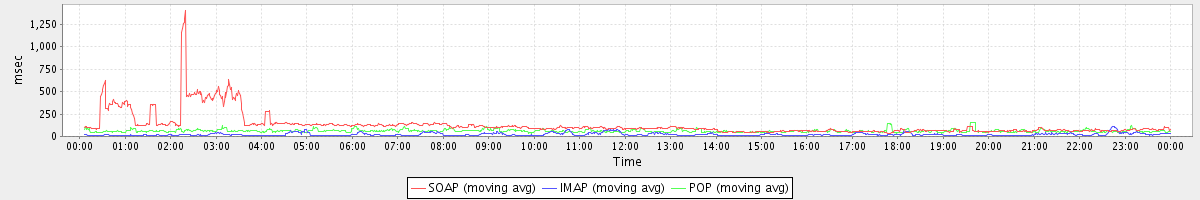 avg(ICalReplyRequest) = 589.75 avg(GetFreeBusyRequest) = 704.24 avg(SyncGalRequest) = 13574.70 avg(CheckRecurConflictsRequest) = 720.50 avg(FolderActionRequest.delete) = 2070.00 avg(SendInviteReplyRequest) = 445.73 avg(AutoCompleteRequest) = 442.66 avg(RemoveAttachmentsRequest) = 1204.50 avg(BackupRequest) = 3952.00 avg(GetQuotaUsageRequest) = 858.00