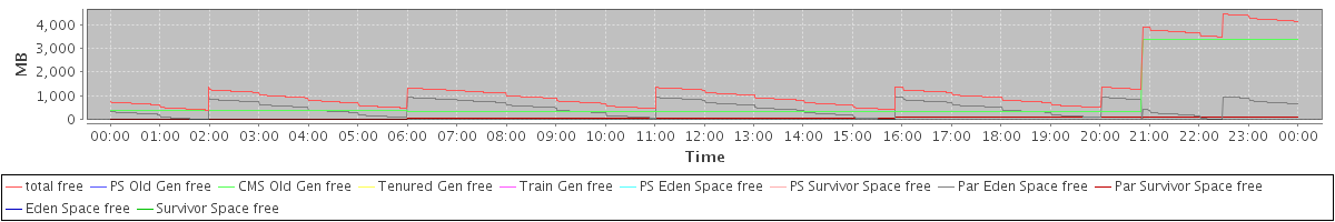 avg(total free) = 1289.87 avg(PS Old Gen free) = 0.00 avg(CMS Old Gen free) = 750.00 avg(Tenured Gen free) = 0.00 avg(Train Gen free) = 0.00 avg(PS Eden Space free) = 0.00 avg(PS Survivor Space free) = 0.00 avg(Par Eden Space free) = 476.48 avg(Par Survivor Space free) = 63.39 avg(Eden Space free) = 0.00 avg(Survivor Space free) = 0.00