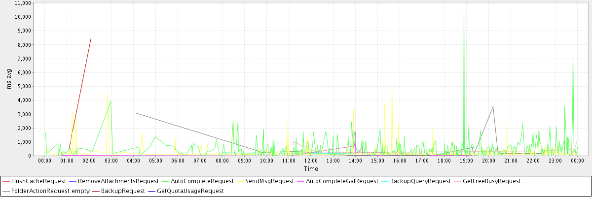 avg(FlushCacheRequest) = 233.00 avg(RemoveAttachmentsRequest) = 207.50 avg(AutoCompleteRequest) = 518.21 avg(SendMsgRequest) = 207.58 avg(AutoCompleteGalRequest) = 163.28 avg(BackupQueryRequest) = 162.00 avg(GetFreeBusyRequest) = 571.00 avg(FolderActionRequest.empty) = 700.31 avg(BackupRequest) = 4436.50 avg(GetQuotaUsageRequest) = 1036.00