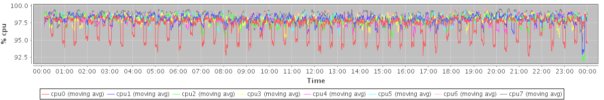 avg(cpu0) = 97.08 avg(cpu1) = 98.01 avg(cpu2) = 97.91 avg(cpu3) = 98.04 avg(cpu4) = 97.98 avg(cpu5) = 98.17 avg(cpu6) = 98.48 avg(cpu7) = 98.51