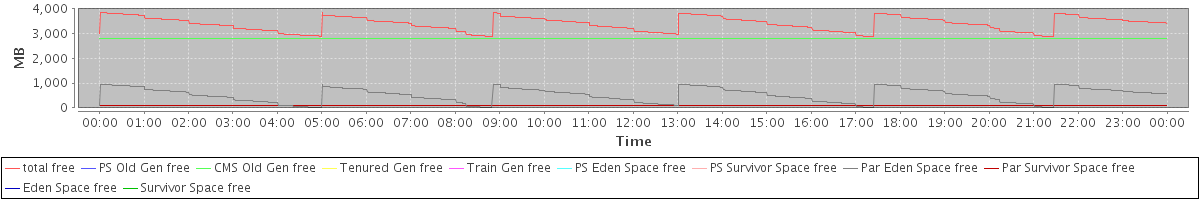 avg(total free) = 3396.43 avg(PS Old Gen free) = 0.00 avg(CMS Old Gen free) = 2791.47 avg(Tenured Gen free) = 0.00 avg(Train Gen free) = 0.00 avg(PS Eden Space free) = 0.00 avg(PS Survivor Space free) = 0.00 avg(Par Eden Space free) = 517.49 avg(Par Survivor Space free) = 87.47 avg(Eden Space free) = 0.00 avg(Survivor Space free) = 0.00