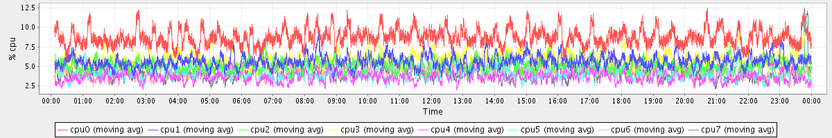 avg(cpu0) = 1.06 avg(cpu1) = 0.71 avg(cpu2) = 0.60 avg(cpu3) = 0.68 avg(cpu4) = 0.42 avg(cpu5) = 0.42 avg(cpu6) = 0.32 avg(cpu7) = 0.31