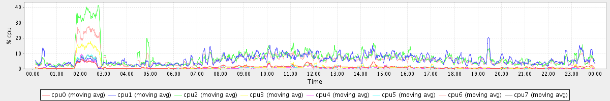 avg(cpu0) = 1.17 avg(cpu1) = 0.24 avg(cpu2) = 0.27 avg(cpu3) = 0.18 avg(cpu4) = 0.13 avg(cpu5) = 0.16 avg(cpu6) = 0.19 avg(cpu7) = 0.15