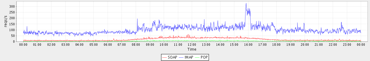 Host zm04.stanford.edu: Mailboxd: Request Rate by Client Protocol