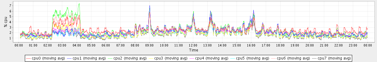 avg(cpu0) = 2.04 avg(cpu1) = 0.29 avg(cpu2) = 0.35 avg(cpu3) = 0.21 avg(cpu4) = 0.26 avg(cpu5) = 0.21 avg(cpu6) = 0.28 avg(cpu7) = 0.17