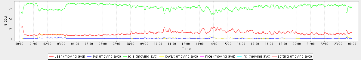 avg(user) = 14.96 avg(sys) = 1.97 avg(idle) = 80.16 avg(iowait) = 2.60 avg(nice) = 0.00 avg(irq) = 0.01 avg(softirq) = 0.29