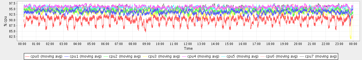 avg(cpu0) = 90.06 avg(cpu1) = 93.63 avg(cpu2) = 94.11 avg(cpu3) = 93.40 avg(cpu4) = 95.89 avg(cpu5) = 95.38 avg(cpu6) = 95.25 avg(cpu7) = 95.41