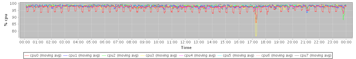 avg(cpu0) = 96.86 avg(cpu1) = 98.03 avg(cpu2) = 98.20 avg(cpu3) = 98.04 avg(cpu4) = 97.95 avg(cpu5) = 98.26 avg(cpu6) = 98.18 avg(cpu7) = 98.28