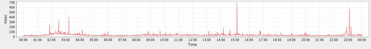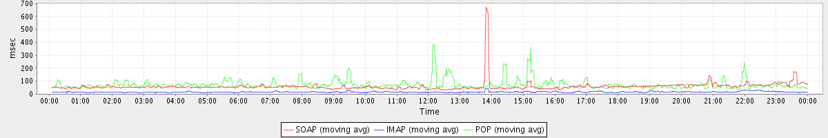 avg(ModifyAppointmentRequest) = 284.74 avg(BackupQueryRequest) = 644.50 avg(GetFreeBusyRequest) = 263.94 avg(SyncGalRequest) = 2797.53 avg(SendInviteReplyRequest) = 519.38 avg(AutoCompleteRequest) = 550.88 avg(ConvActionRequest.delete) = 415.68 avg(FolderActionRequest.empty) = 5495.60 avg(BackupRequest) = 5467.50 avg(GetQuotaUsageRequest) = 1013.00