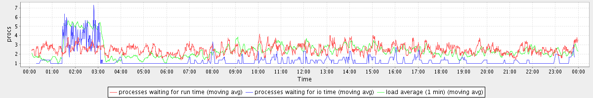 avg(processes waiting for run time) = 2.03 avg(processes waiting for io time) = 0.49 avg(load average (1 min)) = 2.42