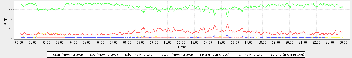 avg(user) = 13.76 avg(sys) = 1.45 avg(idle) = 81.89 avg(iowait) = 2.58 avg(nice) = 0.00 avg(irq) = 0.01 avg(softirq) = 0.28