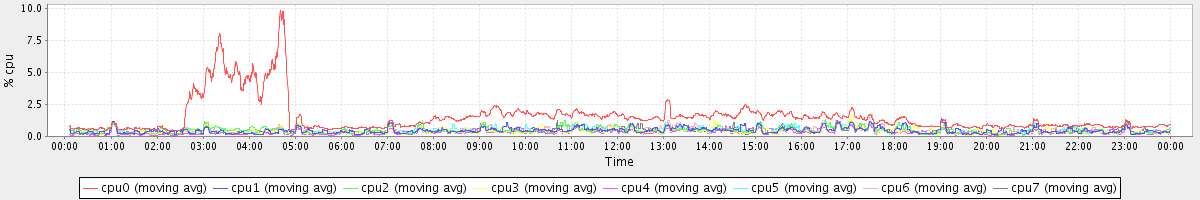 avg(cpu0) = 1.53 avg(cpu1) = 0.45 avg(cpu2) = 0.48 avg(cpu3) = 0.40 avg(cpu4) = 0.32 avg(cpu5) = 0.40 avg(cpu6) = 0.45 avg(cpu7) = 0.37