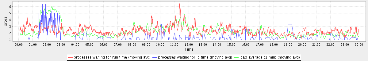 avg(processes waiting for run time) = 1.87 avg(processes waiting for io time) = 0.42 avg(load average (1 min)) = 2.30