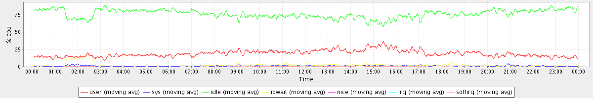 avg(user) = 19.26 avg(sys) = 1.33 avg(idle) = 76.54 avg(iowait) = 2.56 avg(nice) = 0.00 avg(irq) = 0.01 avg(softirq) = 0.29