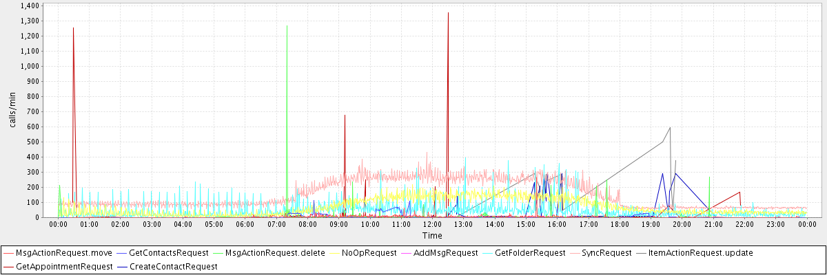 max(MsgActionRequest.move) = 264.00 max(GetContactsRequest) = 115.00 max(MsgActionRequest.delete) = 1268.00 max(NoOpRequest) = 220.00 max(AddMsgRequest) = 87.00 max(GetFolderRequest) = 397.00 max(SyncRequest) = 430.00 max(ItemActionRequest.update) = 597.00 max(GetAppointmentRequest) = 1352.00 max(CreateContactRequest) = 291.00