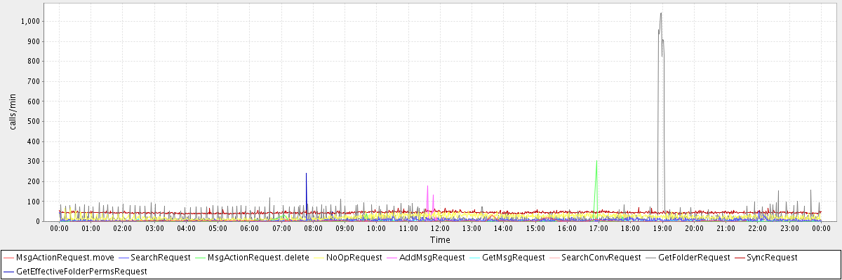 max(MsgActionRequest.move) = 30.00 max(SearchRequest) = 54.00 max(MsgActionRequest.delete) = 303.00 max(NoOpRequest) = 69.00 max(AddMsgRequest) = 177.00 max(GetMsgRequest) = 25.00 max(SearchConvRequest) = 37.00 max(GetFolderRequest) = 1041.00 max(SyncRequest) = 70.00 max(GetEffectiveFolderPermsRequest) = 240.00