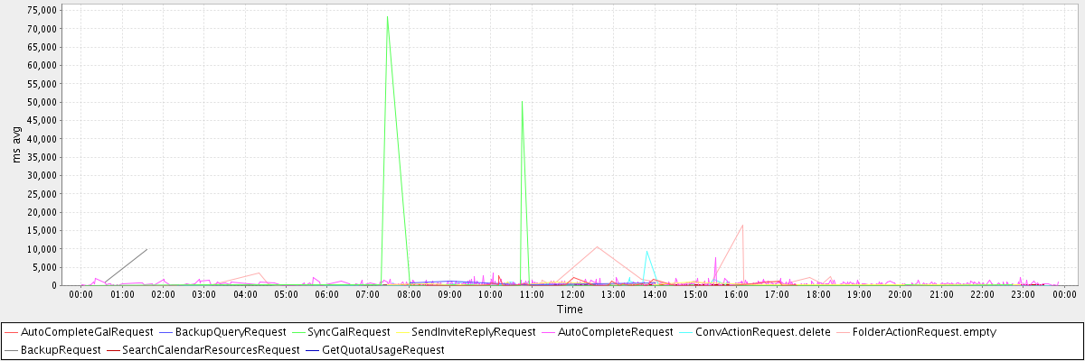 avg(AutoCompleteGalRequest) = 331.61 avg(BackupQueryRequest) = 607.20 avg(SyncGalRequest) = 1835.04 avg(SendInviteReplyRequest) = 361.50 avg(AutoCompleteRequest) = 509.88 avg(ConvActionRequest.delete) = 459.25 avg(FolderActionRequest.empty) = 1376.86 avg(BackupRequest) = 5337.00 avg(SearchCalendarResourcesRequest) = 258.65 avg(GetQuotaUsageRequest) = 2849.00