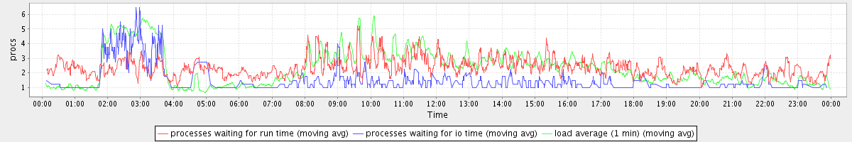avg(processes waiting for run time) = 1.71 avg(processes waiting for io time) = 0.59 avg(load average (1 min)) = 2.32