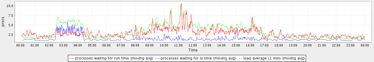 avg(processes waiting for run time) = 2.48 avg(processes waiting for io time) = 0.64 avg(load average (1 min)) = 3.26