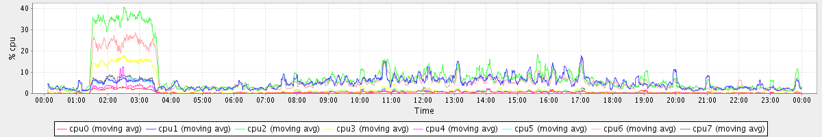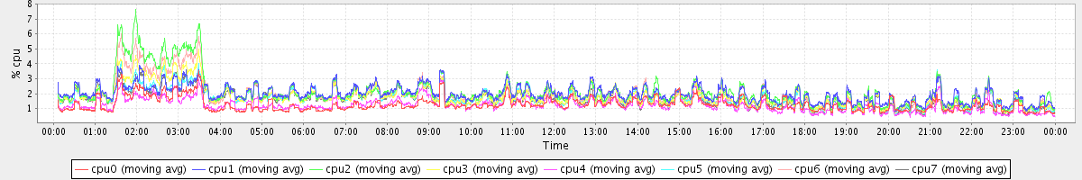 avg(cpu0) = 1.19 avg(cpu1) = 0.28 avg(cpu2) = 0.32 avg(cpu3) = 0.25 avg(cpu4) = 0.17 avg(cpu5) = 0.25 avg(cpu6) = 0.27 avg(cpu7) = 0.22