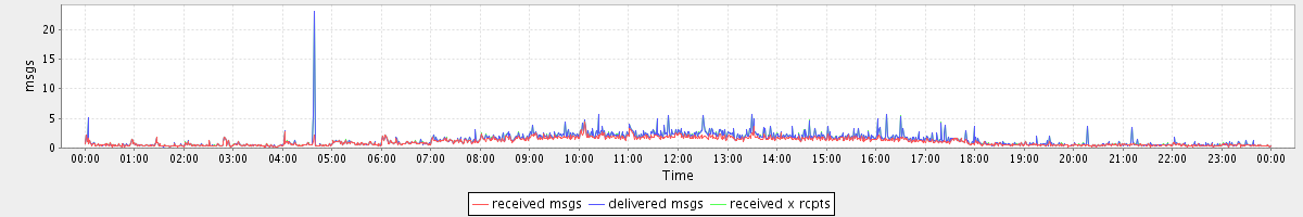 avg(received msgs) = 1.05 avg(delivered msgs) = 1.30 avg(received x rcpts) = 1.32